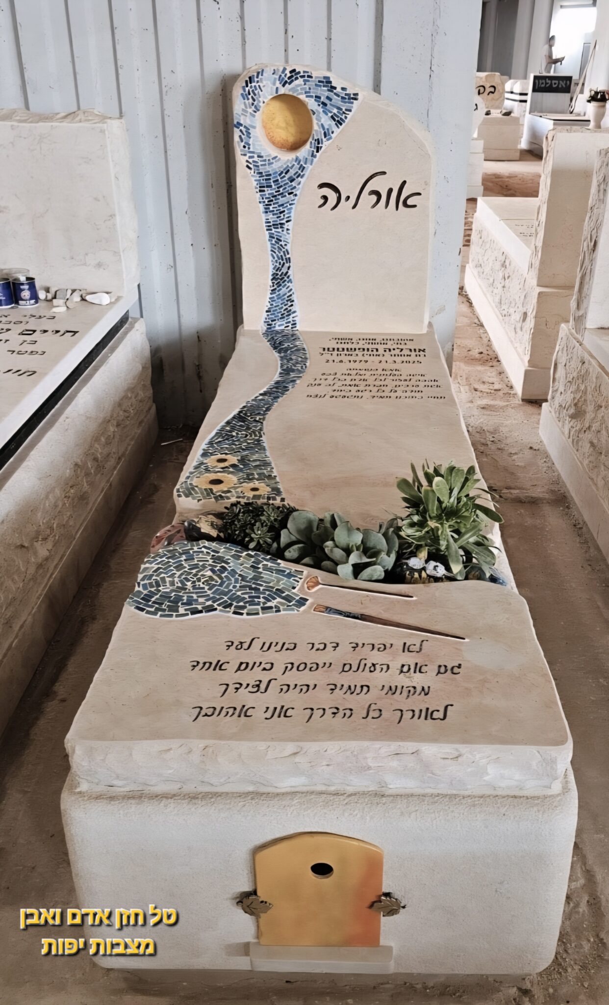 הפסיפס מאפשר לנו "לצייר" בחומר, להוסיף רכות וגוונים שמשתנים עם תנועת השמש בבית העלמין ולהפוך את חלקת הקבר למקום שמספר סיפור אישי ועמוק.
